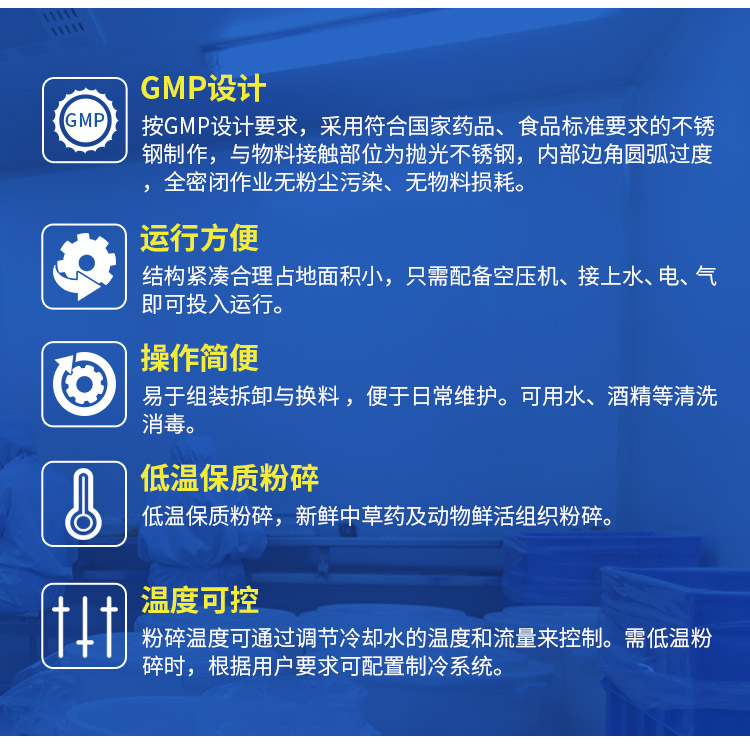 3、技術上的創新。普萊申超微粉碎機在使用操作上有幾大創新:?全自動翻轉物料,自動粉碎(人家的要手動翻轉進料);?雙頭進料,一臺機子當兩臺用(人家的只能單頭進料,粉碎效率低下);?低溫粉碎,自帶制冷功能;?氣密性好,粉碎過程無粉塵,名貴中藥無損耗(別人家的滿屋子都是粉塵,名貴中藥粉碎完畢后重量只有原來的一半);