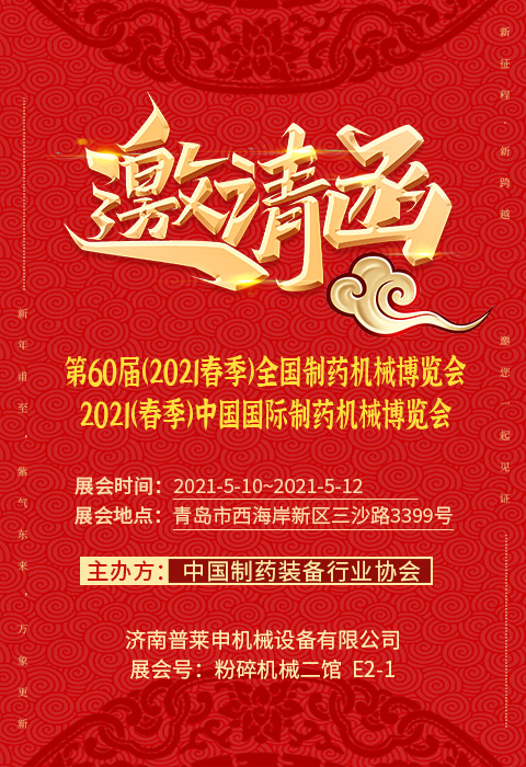 濟南普萊申機械設備有限公司成功申報第60屆2021年(春季)中國制藥機械博覽會(CIPM ),青島制藥機械展,CIPM將于2021年5月10日至5月12日在青島世界博覽城舉行